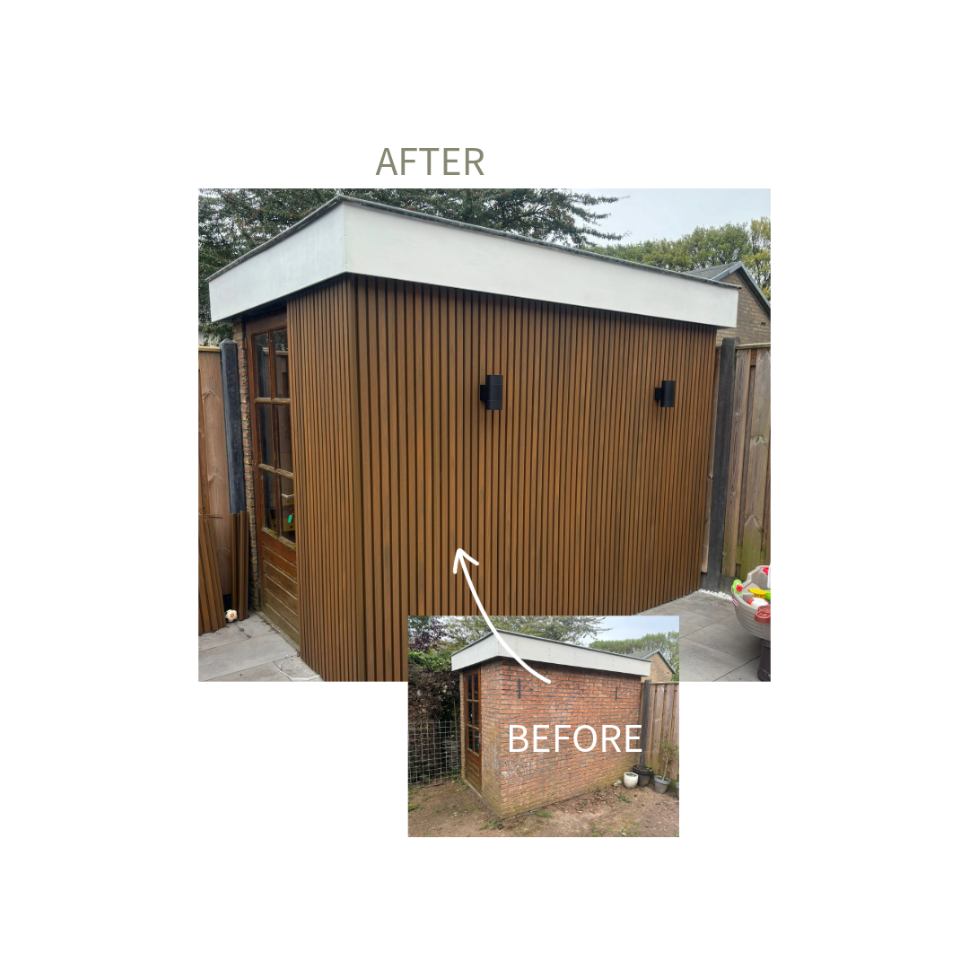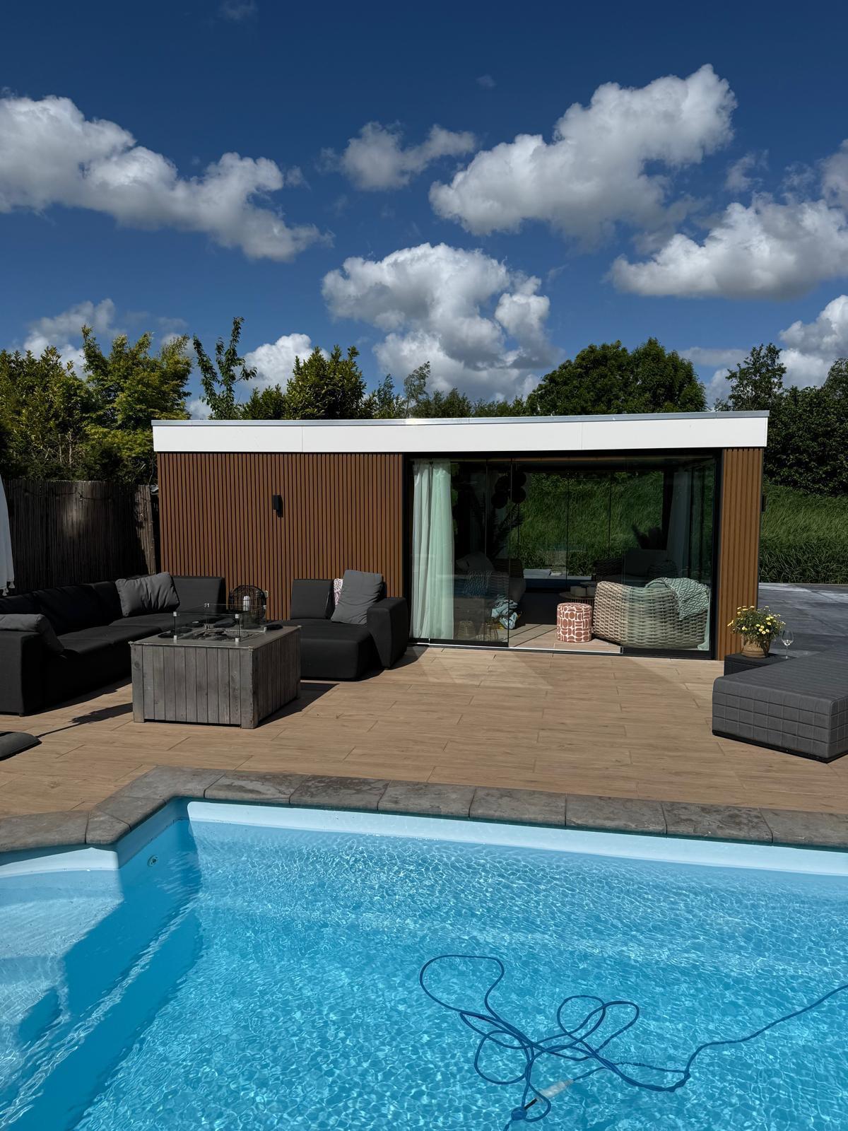 Bestel nuVoor de buitenwand van deze pool house is composiet gevelbekleding in de kleur Teak gebruikt. Voor een nette en stijlvolle afwerking zijn er aluminium afwerkprofielen en composiet hoekprofielen gebruikt.